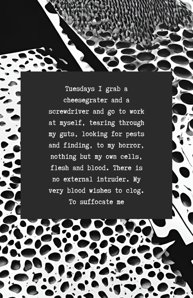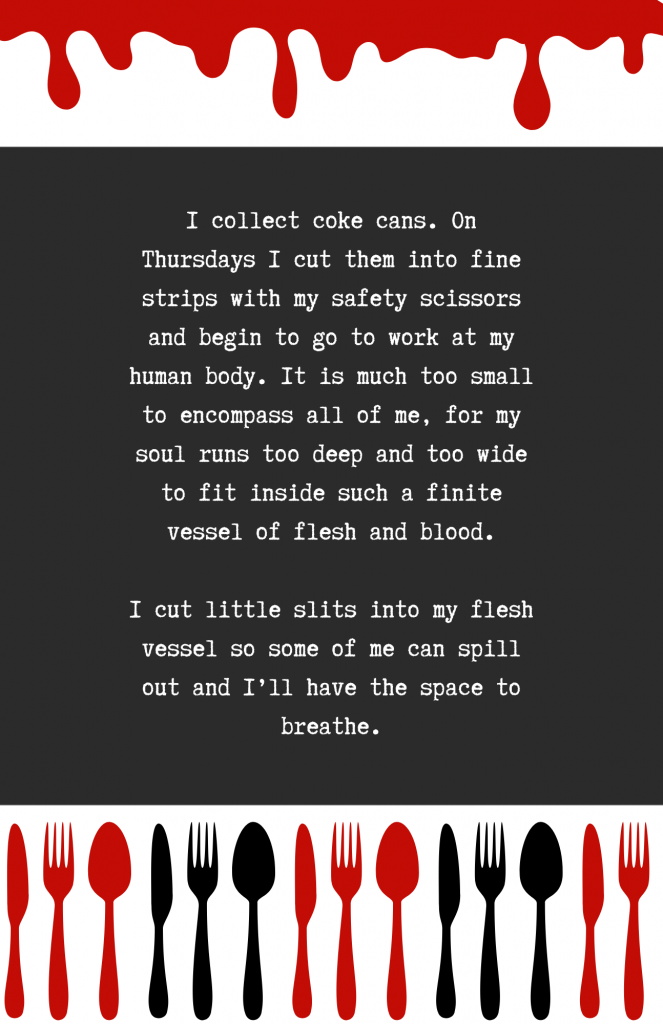 I cut little slits into my flesh vessel so some of me can spill out and I’ll have the space to breathe